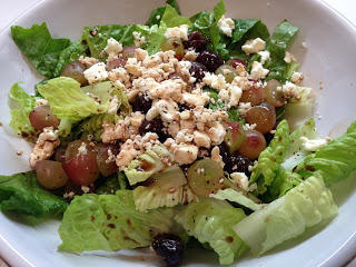 - Prep: Chop romaine lettuce. Cut grapes and olives in halves.